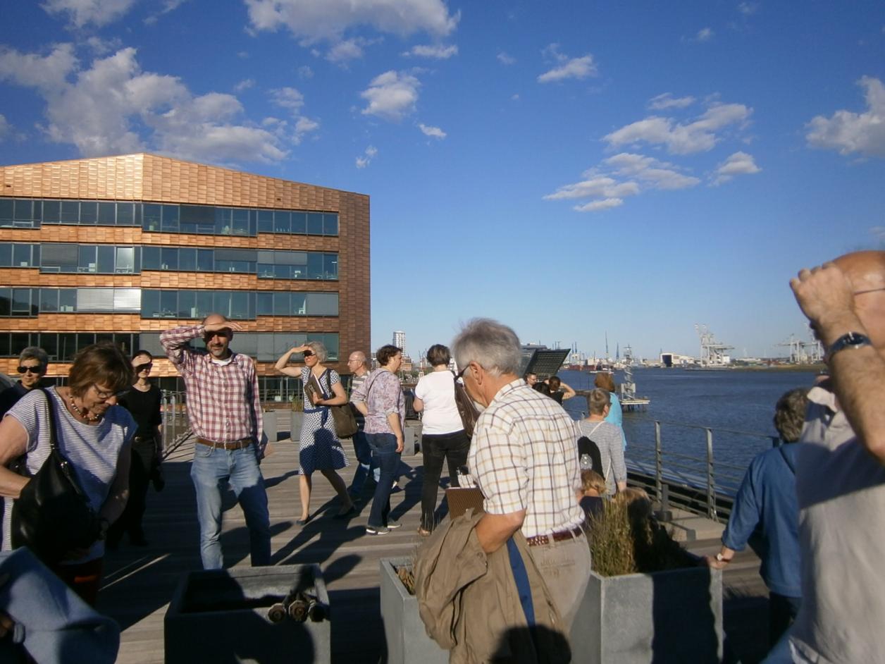 Im Jahr 1924 entstand der Altonaer Kaispeicher als Kornspeicher im Stil des Neuen Bauens an der Altonaer Elbkante. In den Nachkriegsjahrzehnten zunehmend heruntergekommen und verbaut wurde er erst in diesem Jahrhundert wiederentdeckt: Bis 2009 sanierte AUG. PRIEN Immobilien das Baudenkmal aufwendig nach Entwürfen von nps tchoban voss, baute es zur Büro- und Eventnutzung um und ergänzte es um Neubauten von Carsten Roth. Das Ergebnis zeigte uns der Eigentümervertreter Sebastian Reith gemeinsam mit Frank Holst und Prof. Dr. Matthias Kathmann von AUG. PRIEN Immobilien und dem Denkmalpfleger Ulrich Garbe. Bei der Führung wurden mehrere Büroflächen, die Dachterrasse und die zur "weißen Wanne" ausgebaute Tiefgarage besichtigt. Anschließend konnten wir bei einem Getränk im „Hafenbahnhof“ den Elbblick genießen.